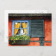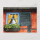Pintura de aquarela original de uma casota colorida, velha e meia-altura, o quadro azul da janela e as cortinas amarelas contrastando com o vermelho da parede da carapaça. Uma lata de pé na borda da janela e flores bonito em uma caixa adiciona ao charme desta pintura.