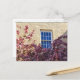 Personalizar esta alteração de cartão postal de endereço! Uma parede de adobe com uma janela branca estilo francês cercada por flores de cereja rosa. Fotografia de Minerva Bloom.