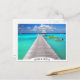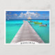 Cartão postal de um cais de madeira com alguns barcos coloridos e uma cabana fechada na lagoa azul-turquesa de Rangiroa, ilha tropical do Pacífico, perto de Tahiti e Bora na Polinésia Francesa com uma borda branca e o texto "Rangiroa".