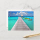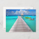 Cartão postal de um cais de madeira com alguns barcos coloridos e uma cabana fechada na lagoa azul-turquesa de Rangiroa, ilha tropical do Pacífico, perto de Tahiti e Bora Bora, na Polinésia Francesa.