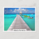 Cartão-postal de um cais de madeira com alguns barcos coloridos e uma cabana fechada na lagoa azul-turquesa de Rangiroa, ilha tropical do Pacífico, perto de Tahiti e Bora na Polinésia Francesa com borda branca e o texto "Polinésia Francesa".