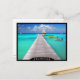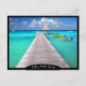 Cartão-postal de um cais de madeira com alguns barcos coloridos e uma cabana fechada na lagoa azul-turquesa de Rangiroa, ilha tropical do Pacífico, perto de Tahiti e Bora na Polinésia Francesa com borda negra e em branco o texto 'Polinésia'.