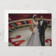 Uma figurina de casal de casamento numa mesa de casino com batatas fritas de casino no fundo mostrando que alguém aposta no casamento