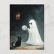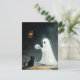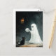 Uma cena divertida de Halloween com um fantasma que quer brincar com um gato com uma bola de fio