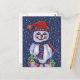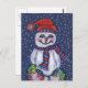 Este cartão postal é azul escuro com um boneco de neve alegre vestindo um chapéu e cachecol segurando uma corda de luzes de Natal brilhantes na neve caindo.