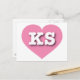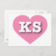 Este cartão-postal apresenta um coração cor-de-rosa vibrante contendo as letras maiúsculas, brancas e em negrito KS, a abreviação oficial para Kansas, o estado de girassol. O reverso do cartão postal é vazio, aguardando seus sentimentos manuscritos ou texto personalizado.
