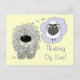 Cartão de posto mostrando um cão Komondor adorável pensando em sua ovelha. Na legenda do cartão-postal lê-se: "Pensando em nós!". O plano de fundo é exibido como uma cor amarela, mas ele e a fonte e frase podem ser facilmente personalizados para o que você quiser.