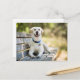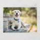 Um cão Labrador Amarelo que sorri enquanto se coloca em um banco de madeira ao ar livre em um dia ensolarado.