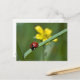 Uma ladybug (também conhecida como ladybird ou joelho) dando um passeio ao longo de uma folha de erva com uma flor amarela de rato-de-porco ao fundo. Fotografia macro tirada no Reino Unido. Personalize para adicionar seu próprio texto e outras opções.