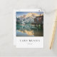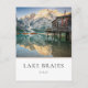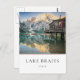 Cartaz fotográfico da casa de barco na água do lago Braies/Pragser Wildsee, com reflexo das montanhas Dolomites na água tranquila do Tirol do Sul, Itália com uma caixa branca com o texto "Lake Braies, Itália" e linhas em verde, branco e vermelho, as cores da bandeira italiana.