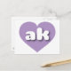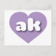 Este cartão-postal apresenta um coração de lavanda suave contendo as letras em negrito, branco, arredondado, minúsculas ak, uma abreviação lúdica para o Alasca, o estado-fronteira. O verso do cartão postal é vazio aguardando seu texto personalizado ou sentimentos escritos à mão.