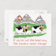 "If you're not the lead cow the scenery never changes." Humorous cartoon cows parade through green pastures with edelweiss at the foot of the Alps.