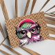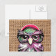 Uma legal coruja colorida rosa púrpura engraçada com óculos. Um design único no fundo da textura marrom da juta. A ideia perfeita de presente de humor para qualquer um em qualquer ocasião.