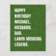 Um cartão de aniversário ousado do Lawn Mowing Legend com uma tipografia branca limpa definida contra um fundo de grama realista.