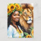 Cartão Postal Leo Black Woman com girassóis e leão
