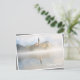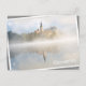 Cartaz fotográfico de um nascer do sol nebuloso no lago Bled com reflexo da ilha com a igreja na água do lago e com o Castelo Bled ao fundo num belo dia de outono na Eslovênia, com uma borda branca e a preto o texto "Eslovênia". A imagem é um pouco rotacionada para criar a ilusão de ela se soltar.