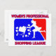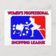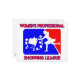 Símbolo vermelho e azul desportivo profissional de uma silhueta branca de uma mulher a correr freneticamente com um carrinho de compro carregado, com produtos a voar em todo o lado. Frase, "Liga de Compro Profissional das Mulheres" escrita abaixo em letra vermelha de bloco divertido com contorno azul.