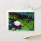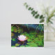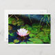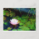 Um lírio de água solteiro floresce num jardim de água do quintal. O capim cresceu sobre os lados da lagoa à medida que as almofadas de lírio flutuavam no topo da água. Uma pequena ondulação aparece como um peixe koi que mostra a parte superior da água para qualquer insetos. Os lírios de água fornecem comida para peixes e espécies selvagens. Pintura digital usando Pintor de Corel.