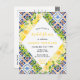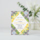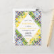 Este cartão postal de chá de panela divertido e caprichoso apresenta limões e folhagem de citros de aquarela em fundo de azulejo mediterrânico. O texto combina o script manuscrito e as fontes serif para uma aparência na moda e moderna. Isto é perfeito para um chá de panela rústico de verão.