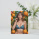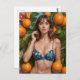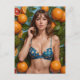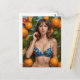 Uma senhora sexy no topo de um biquíni floral segura uma pintura gerada por IA laranja