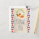 Um cartão postal de agradecimento com um desenho de uma raposa fofa dormindo pacificamente. Uma coroa de folhas verdes atrás. O fundo é um padrão com bolinhas pálidas e macarons coloridos sobrepostos. Mensagem personalizada no verso.