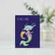 Lindo cartão postal de melhoras em azul marinho com uma ilustração de uma sereia com um braço quebrado. O peixinho está adicionando arte ao seu gesso. A mensagem diz "Melhoras" mas você pode personalizá-la e até customizá-la ainda mais para mudar a fonte, sua cor e tamanho.