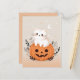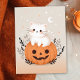 Envie saudações adoráveis de Halloween com este lindo cartão postal de Halloween apresentando um gato branco encantador sentado em uma abóbora laranja de jack-o'-lantern, cercado por folhagens. O fundo é decorado com estrelas e uma lua crescente, criando uma cena caprichosa de Halloween. Todo o design é em tons pastel suaves, tornando-o perfeito para quem ama uma mistura de doce e assustador. Este cartão postal de Halloween em pastel é ideal para adicionar um toque divertido às suas mensagens de Halloween.