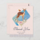 Um cartão postal de agradecimento de festa com elegância rústica, Projetado com um lindo cervo marrom com costas manchadas de branco. Um pequeno pássaro sentado nas costas do cervo. Um buquê de rosas florais sofisticado em rosa pastel e verde oliva claro sob os pés do cervo. Um retângulo de aquarela azul atrás da imagem. Uma borda de bolinhas ao longo da parte inferior. Design inocente e doce com elegância rústica. Fundo colorido pêssego.