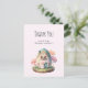 Cartão de agradecimento com uma imagem adorável de um coelho redondo em pé fora de sua casa em forma de ovo. Tem um estilo kawaii japonês pastel.