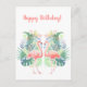 Feliz Aniversário! Cartão Postal Romântico com Ilustração em Aquarela "Lindo Conto de Fadas Para Dois Flamingos", texto em caligrafia - "Paz, Alegria, Amor", Belos dois flamingos rosa, flores exóticas tropicais, folhagens, ornamento floral da selva, jardim, verão, viagem, feriado, aniversário, férias (presentes para ela). Convites e Material de Papelaria > Cartões Postais. Modelo de texto. Personalize adicionando o nome. Decoração gráfica em dois lados.