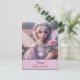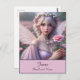 Uma bela fada rosa pálida, penteada, com asas rosa pálidas vestindo um vestido de lavanda pálido e um colar de pérolas segura uma rosa solteiro enquanto está em um campo de rosas.