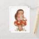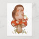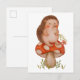 Design alegre de cartão postal com um ouriço adorável sentado em um cogumelo caprichoso, segurando um buquê de flores em uma ilustração encantadora em aguarela.