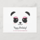 Cartão postal de Feliz Aniversário de panda fofo. Rosto de panda preto e branco kawaii com cílios rosa brilhantes.