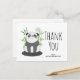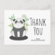Cartão postal de agradecimento de festa com ilustração de um urso panda preto e branco sentado em alguns bambus em aquarela verde. Um pequeno balão de fala com um coração dentro. Panda fofo expressando seu amor.
