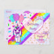 Personalize esses convites de aniversário de menina adoráveis com um unicórnio mágico, corações, laços, balões, confeitos, borboleta e arco-íris. Rosa, roxo, azul, amarelo e laranja são as cores deste convite de aniversário de menina.