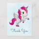 Cartão de agradecimento com um unicórnio alado branco com crina rosa, cauda e cascos. O chifre tem anéis de cor de arco-íris e parece um pirulito de doce. Este adorável unicórnio está se empinando nas patas traseiras. Coração rosa doce na bochecha.