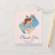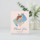 Um cartão postal de agradecimento de festa com elegância rústica, projetado com um lindo veado marrom com costas manchadas de branco. Um pequeno pássaro sentado nas costas do veado. Um buquê de rosas florais sofisticado em rosa pastel e verde-oliva claro sob os pés do veado. Um retângulo de aquarela azul atrás da imagem. Uma borda de bolinhas ao longo da parte inferior. Design inocente e doce com elegância rústica. Fundo colorido pêssego.