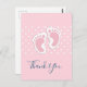 Cartão de agradecimento com uma imagem encantadora de pegadas de bebê menina rosa com bolinhas brancas em um fundo rosa definido atrás da ilustração.