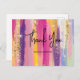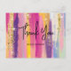 Cartão de agradecimento com um design de fundo abstrato. Listras vibrantes em cores fortes e pastéis. Cores rosa, azul, roxo e amarelo combinadas com brilho falso dourado sobreposto.