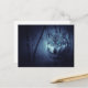 Cartão postal com imagem de um lobo mágico e místico em pé em uma floresta com neve suave caindo ao redor.