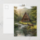 A postcard to say hi to friends and family with a wilderness nature theme. The illustration is an a-frame log cabin out in the mountains and woods with a deer next to a rippling stream.