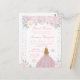 Este convite de aniversário de dezesseis anos de inverno elegante e glamoroso apresenta uma bela princesa com cabelos loiros e pele clara em um vestido de baile rosa. O texto combina caligrafia manuscrita e fontes modernas sem serifa para um visual sofisticado e elegante. As arranjos florais, flocos de neve e confetes prateados criam a combinação perfeita de rústico e chique.