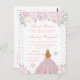 Este convite de aniversário de dezesseis anos de inverno elegante e glamoroso apresenta uma bela princesa com cabelos loiros e pele clara em um vestido de baile rosa. O texto combina caligrafia manuscrita e fontes modernas sem serifa para um visual sofisticado e clássico. Os arranjos florais, flocos de neve e confetes prateados criam a combinação perfeita de rústico e chique.