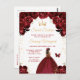 Este convite de aniversário de dezesseis anos elegante e glamoroso apresenta uma bela princesa com cabelos castanhos em uma linda roupa de gala vermelha de Borgonha. O texto combina caligrafia manuscrita e fontes modernas sem serifa para um visual sofisticado e elegante. As arranjos florais, borboleta e confetes dourados criam a combinação perfeita de rústico e chique.