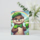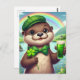 Uma lontra fofa com chapéu verde e gravata borboleta segura um trevo e uma cerveja verde com um arco-íris ao fundo - arte fantasia