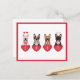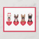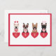 Ilustração de três cachorros franceses do Bulldog de diferentes cores saindo de corações vestidos de trajes de Dia de os namorados.