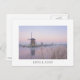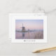 Cartão-postal de uma paisagem de conto de fadas com moinhos de vento velhos à luz pastel macia de um nascer do sol de inverno com gelo no rio e geada nas sementes de uma manhã fria em Kinderdyke, Países Baixos com uma fronteira branca e o texto "Holanda".
