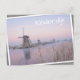 Cartão-postal de uma paisagem de conto de fadas com moinhos de vento velhos à luz pastel macia de um nascer do sol de inverno com gelo no rio e geada nas sementes de uma manhã fria em Kinderdyke, Países Baixos, com o texto "Kinderdijk". A placa tem uma borda branca e está um pouco torcida para criar a ilusão de se soltar.