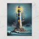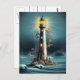 Um farol solitário emite luz sobre um afloramento rochoso enquanto as ondas subem em sua base, criando uma vista noturna serena.