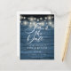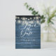 Este cartão de save the date rústico apresenta lindas luzes de corda e um elegante save the date em letra cursiva acima dos seus detalhes em uma tipografia elegante sobre um fundo de painéis de madeira azul rústica. O verso apresenta detalhes adicionais do save-the-date, incluindo o código QR do site do seu casamento, com o seu endereço de retorno e espaço para o endereço do destinatário. Criado por Thisisnotme©